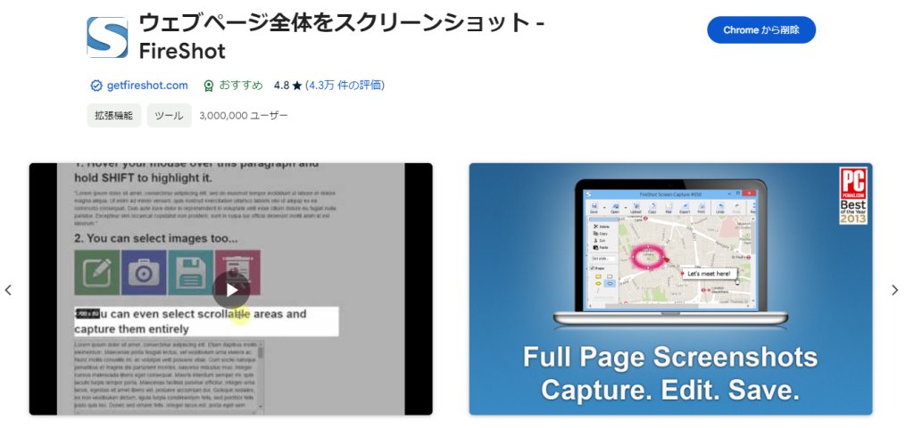 今回「FireShot」の使用方法は説明しませんが、この拡張機能を使うことでスクショが撮れるようになります。