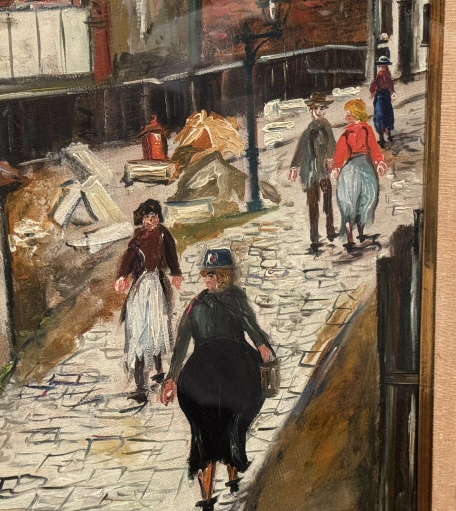 ユトリロ作品の特徴として、画面に奥行きを生み出すために道の先を遠くまで描き込む手法があります。そのため、道が奥へ進むにつれて“圧縮効果”のような視覚効果が生まれ、より強い奥行き表現につながっています。
